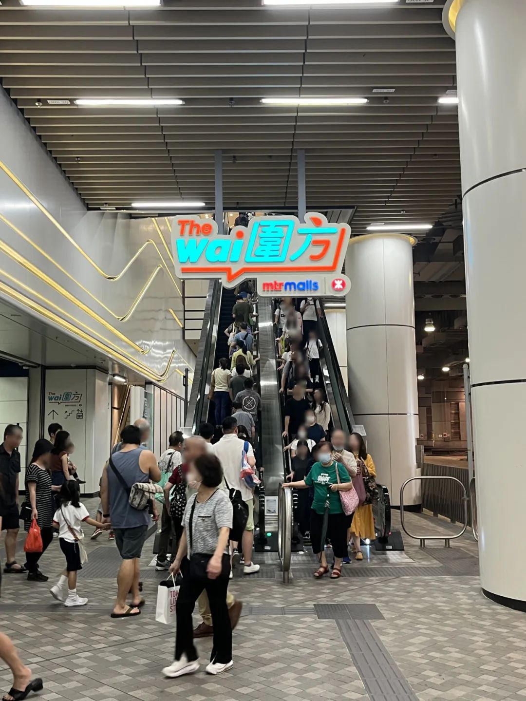 从大围站B口出来,正前方就是巴士总站,旁边进出围方商场的电扶梯站满了人,已经需要排队坐扶梯进入商场。