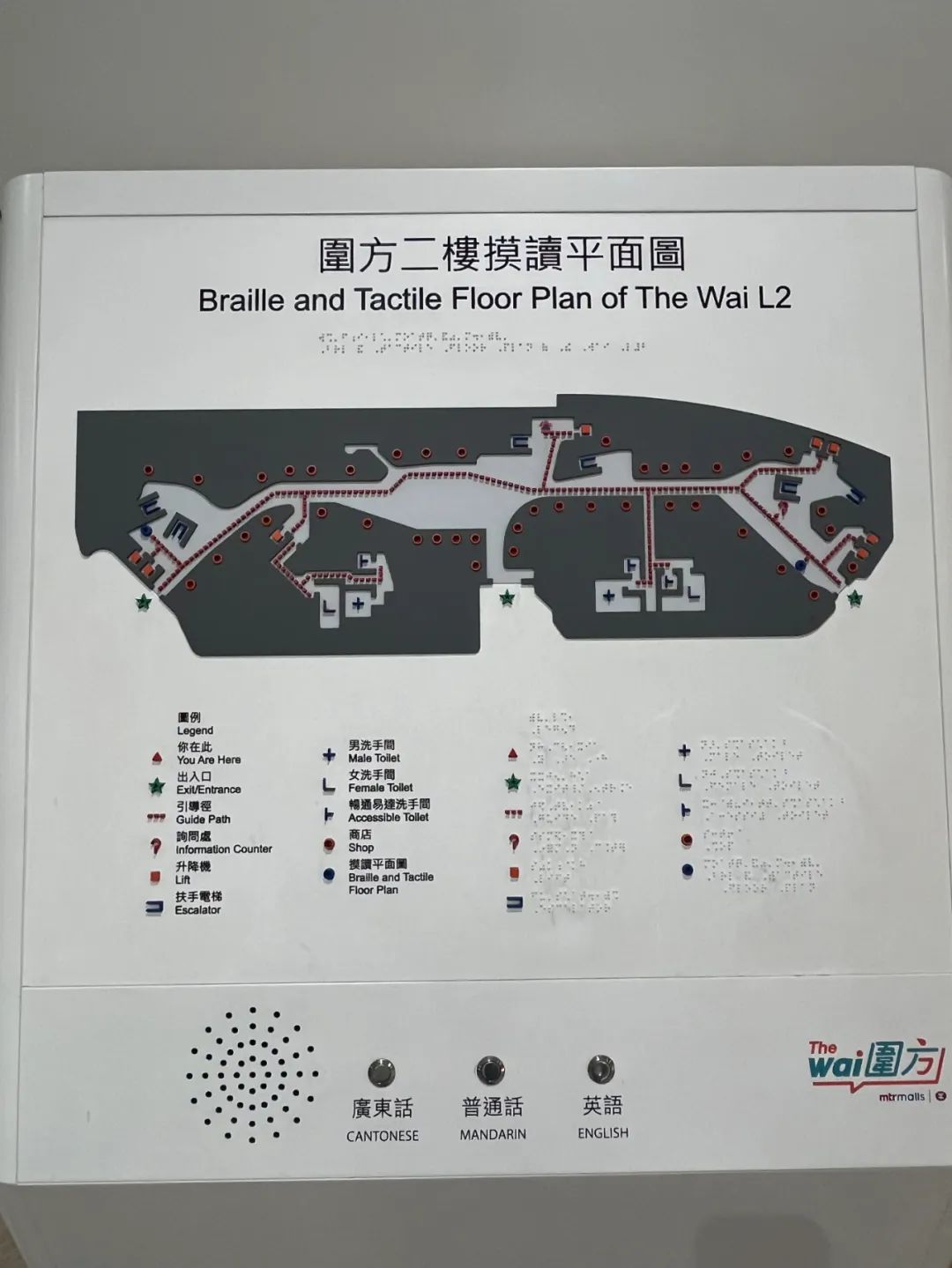 商场的导视标识非常多,也非常清晰;平面图上不仅有多种语言,还设置有盲文;商场的首层L2层还设置有一条盲道,对于视障人士非常友好。